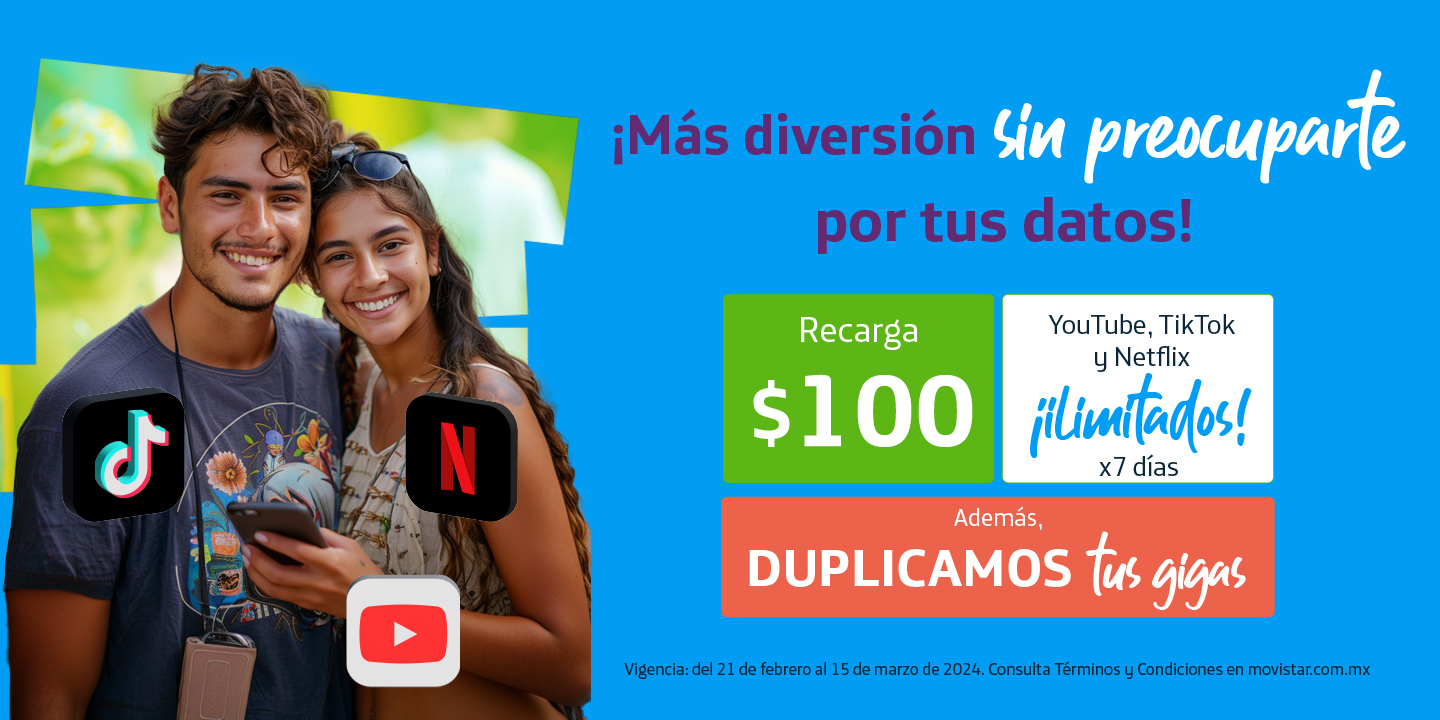 Para que tus días sean más divertidos, te damos YouTube, Netflix y TikTok ILIMITADOS x7 días con tu recarga de $100. ¡Recarga y aprovecha!